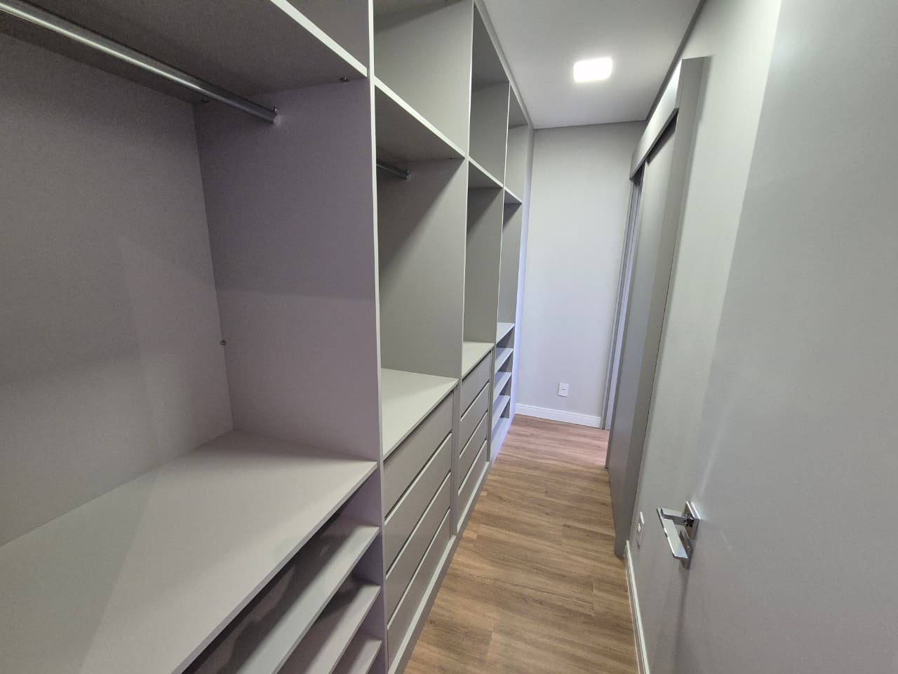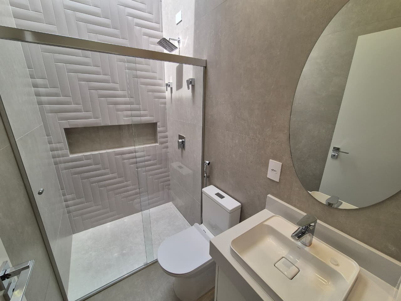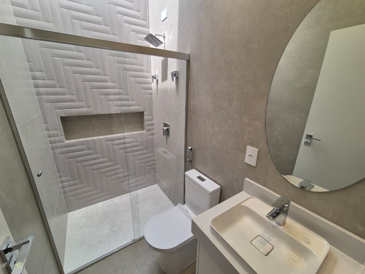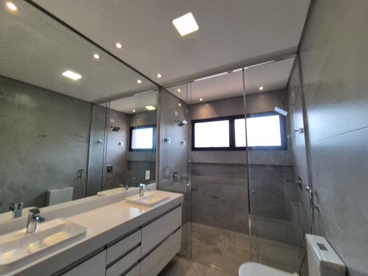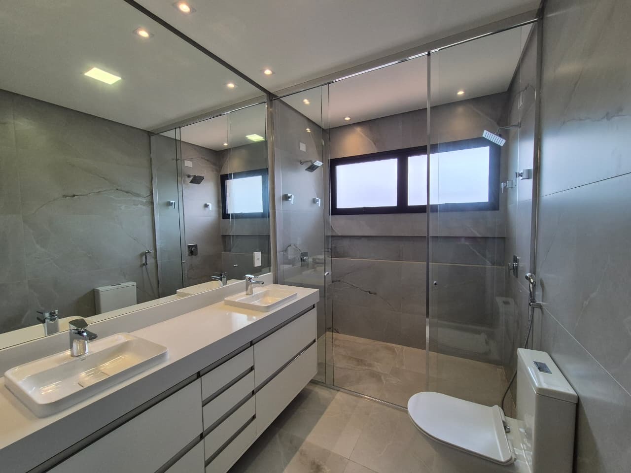 3 suítes, incluindo suíte master com banho duplo, cubas Deca, chuveiro duplo, ducha higiênica e box Blindex até o teto